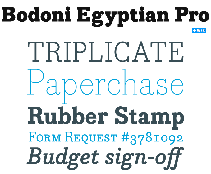 Usually not a fan of serif fonts, but I like the retro styling of Bodoni Egyptian. Lots of variety in weights make it diverse and fun.